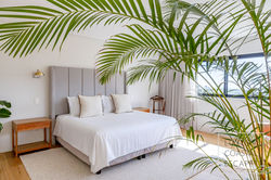 A guest bathroom and washroom are located off the main living area. Further along the corridor is a guest bedroom with wooden floors, large windows, and sweeping mountain and sea views. This room features a queen bed and an en suite bathroom with shower.